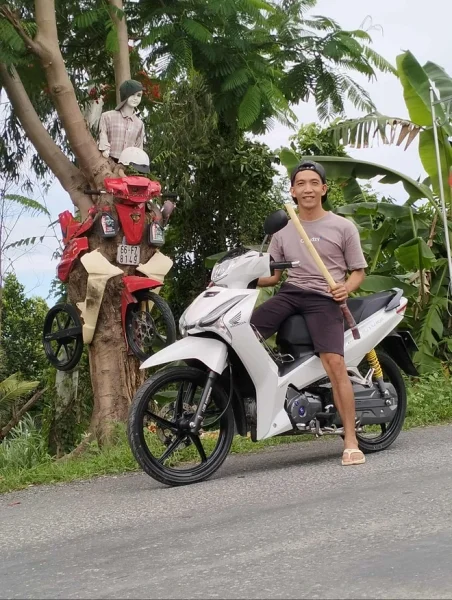 アンザン省の小道にある木の上に出現した奇妙なオブジェが話題になっている。太い幹の前方にはバイクの前輪と車体の前部が食い込んでいて、後方には後輪が突き出ている。両サイドにはバイクのサイドパーツが貼り付けてあり、運転席部分に当たる2本の細い幹の間にはシャツを着たマネキンの上半身が飾られている。遠くから見ると赤いバイクに乗ったドライバーがバイクごと古木の幹を突き抜けているように見える。