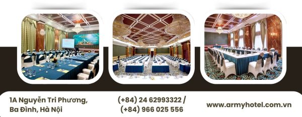 ハノイ市の中心に位置する「ARMY HOTEL」では,30~300名まで対応可能な会議室を完備。会議,セミナー,研修,契約式などに最適! 8月末までセミナープランの特別割引を実施中。会議室利用料20%OFF,ミネラルウォーター・筆記用具・ウェルカムティー,音響・プロジェクター・駐車場を無料で提供。会議室は希望に応じたレイアウトに変更可。宿泊とセットでさらにお得に! 詳細はお問い合わせを。