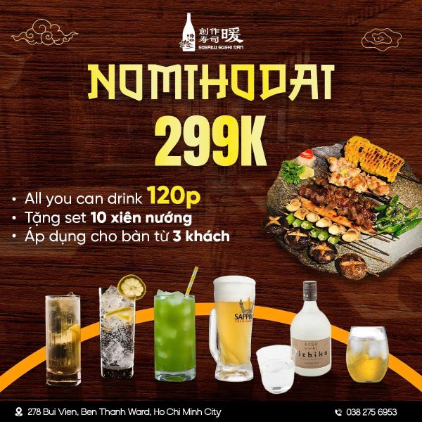 モダン居酒屋スタイルの日本食レストラン「Sosaku Sushi Dan」では,120分の「飲み放題プラン」が1名あたり29.9万VNDで楽しめる。「サッポロビール」,カクテル,日本酒などの飲み放題に加え,串焼き10本が含まれる。3名以上のグループでの利用が対象。この機会をお見逃しなく!
