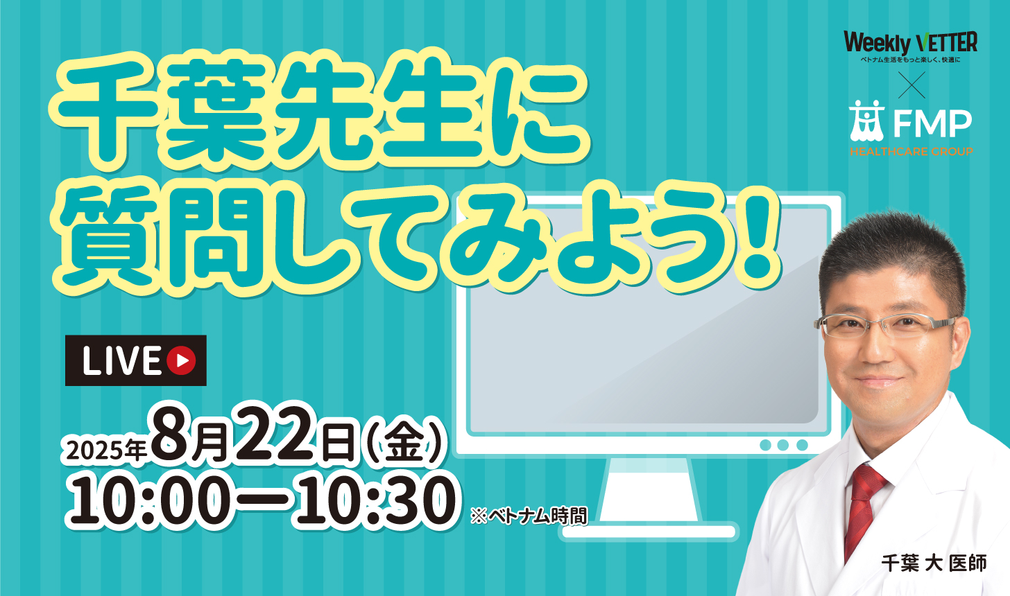 今回の相談会では、ベトナム在住の日本人内科医が、皆様からの質問にライブ形式でお答えします。匿名で質問できるため、普段は聞きにくい些細な疑問も安心してご相談いただけます。