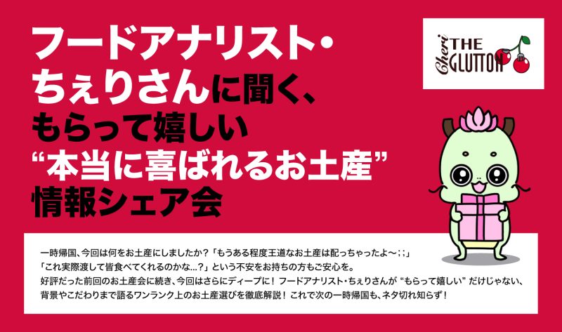 一時帰国、今回は何をお土産にしましたか?「もうある程度王道なお土産は配っちゃったよ~;;」「これ実際渡して皆食べてくれるのかな…?」という不安をお持ちの方もご安心を。好評だった前回のお土産会に続き、今回はさらにディープに!フードアナリスト・ちぇりさんが“もらって嬉しい”だけじゃない、背景やこだわりまで語るワンランク上のお土産選びを徹底解説! これで次の一時帰国も、ネタ切れ知らず!