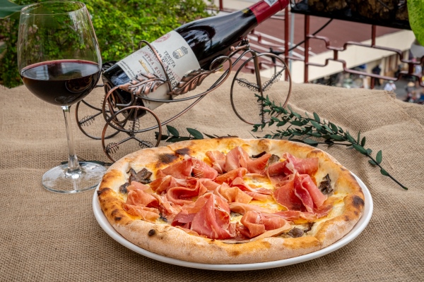 同店自慢のピザは、生地を48時間かけて低温発酵させた手ごねによるもの。ふんわり軽く、何枚でも食べたくなる。生ハムの塩気やサラミの辛味、香り高いトリュフがのり、ほんのり甘みのあるチーズとトマトソースが全体を絶妙にまとめている。