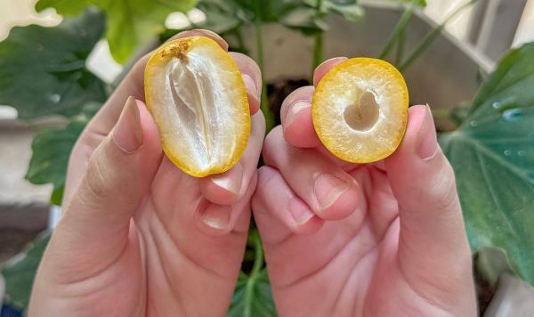 生デーツは親指ほどの大きさで楕円形。大きな房にたくさん実り、熟すと黄金色で滑らかで光沢のある殻になる。洗うだけですぐに食べられ、中は少しカリッとしていて、中心にはドライデーツで見慣れたあの細長い種が入っている。