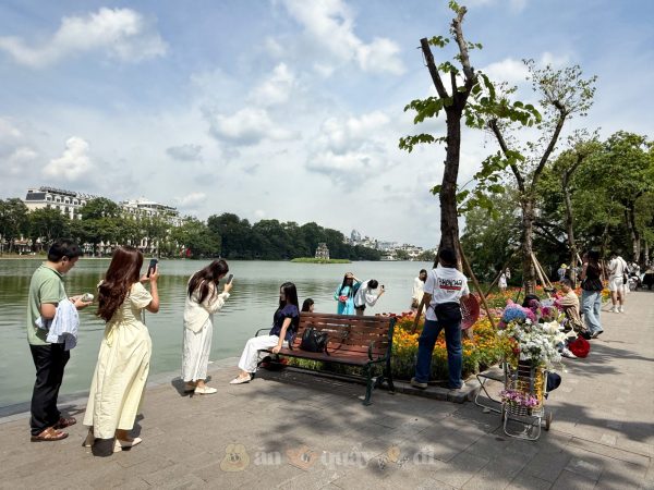 足元には一面に咲き誇る花々、背後には鏡のように穏やかで澄み切った湖面、遠くにはホアンキエム湖(還剣湖)の物語に登場する伝説の金の亀を記念して建てられたランドマーク「亀の塔」がそびえ立つこの場所は、まさにハノイらしい写真を撮るには理想的な場所。ホアンキエム湖で撮影された写真は、SNS上で爆発的に拡散され、多数の「いいね!」やコメントを獲得している。特にある写真家が「撮影した写真があまりにも美しかったため、一切加工せずにそのまま投稿した」と明かしたことは話題となった。実際、この時期のホアンキエム湖周辺の鮮やかな景色は、通りすがりの誰もが思わず立ち止まって眺めたくなるほど美しく、訪れた人々は「ホアンキエム湖がこれほどまでに芸術的になるとは思ってもみなかった」と驚きを隠せない。若者たちは、湖面が静まり返り木々の間から柔らかな陽光が差し込む早朝や、夕日が辺り一面を黄金色に染める夕暮れ時を狙って訪れている。