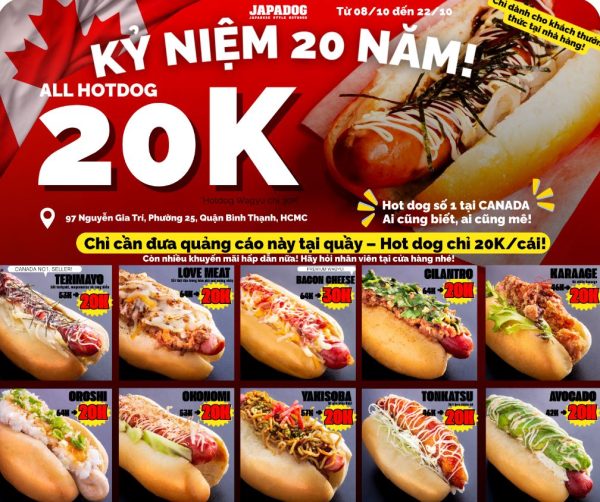 ホットドッグ店「JAPADOG」では,オープン20周年を記念した特別キャンペーンを実施。10月8日(水)から10月22日(水)までの期間限定で対象のホットドッグが1本2万VND(※和牛ソーセージ商品は3万VND)。キャンペーン画像をレジで提示した方のみの特別価格となり,店内飲食のみがキャンペーン対象となる。