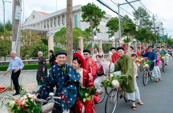 ビンロン省(旧ベンチェ省)で行われたあるご近所カップルの結婚式の写真が、SNS上で話題になっている。その理由は花婿が自転車で花嫁を迎えに行く、という可愛らしい演出にある。花婿のズイさんの実家から花嫁のチャンさんの実家までの距離は、わずか250m。当初は両家とも利便性を考え、花嫁の家まで歩いて行く予定であった。だがこのわずか250mという距離をどのように移動したらよりドラマチックになるかと考えた新郎新婦は、愛と友情を育みつつ、生涯忘れられない思い出を残すべく、自転車を使うことを選択した。