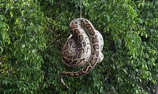 すぐに当局に通報し、周辺住民らも手伝って、竹や縄などを使って木から降ろし、同日午後4時30分ごろにニシキヘビを捕獲した。