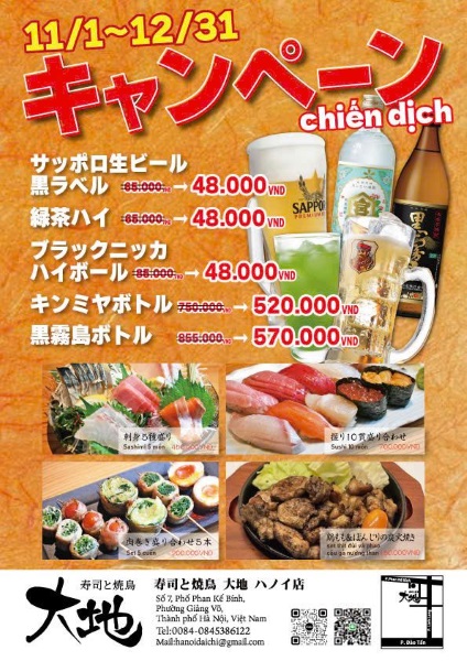 豊洲直送の鮮魚と炭火香る焼き鳥が自慢の「大地」では,ドリンクキャンペーンを実施中! 「生ビール」「お茶ハイ」「ニッカハイボール」が4.8万VND,「黒霧島ボトル」が57万VND,「キンミヤボトル」が52万VNDに。12月末まで。