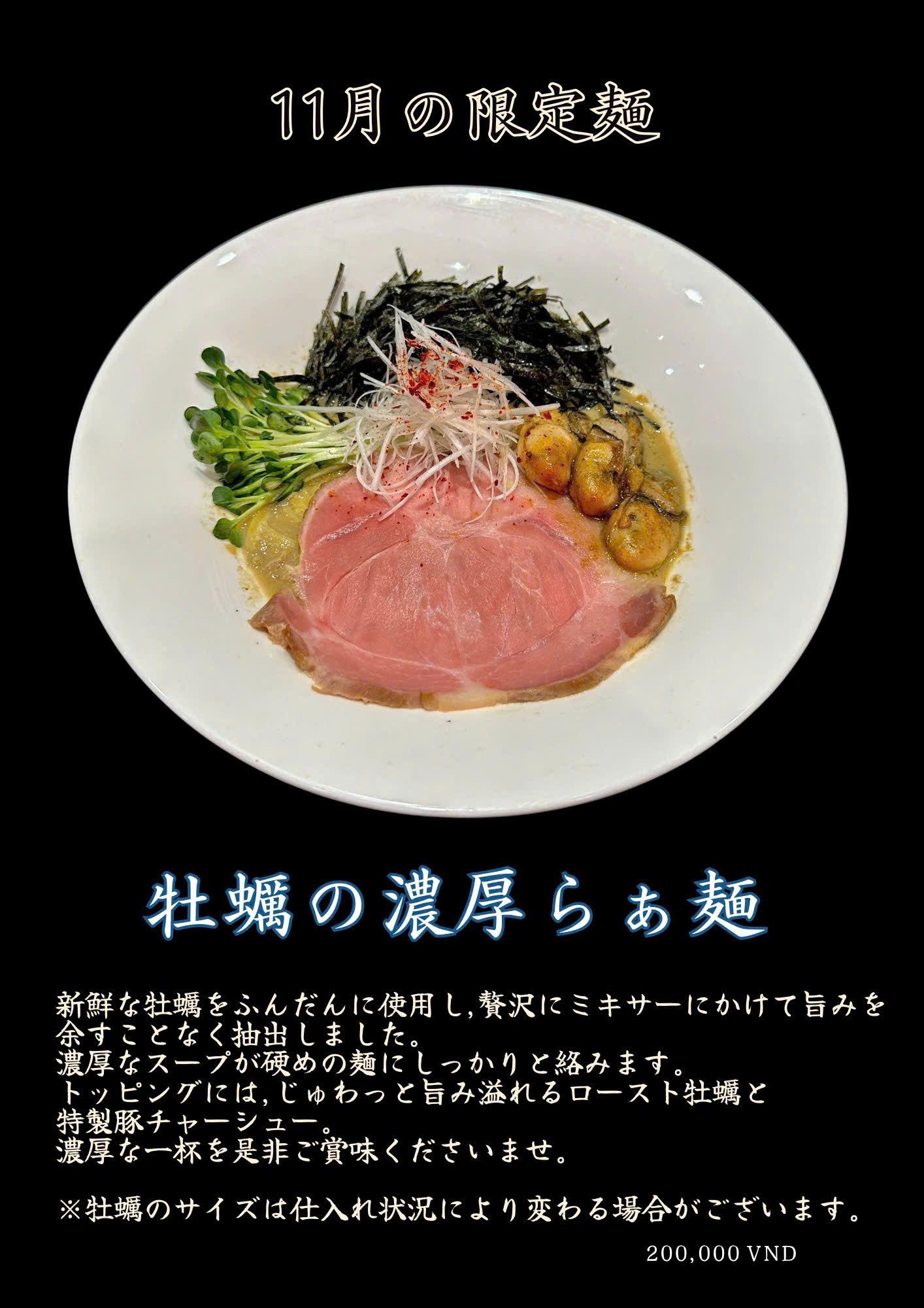 日本人のラーメン職人が腕をふるう「らぁ麺春樹」では,11月限定で「牡蠣の濃厚らぁ麺(20万VND/税込み)」が新登場! 新鮮なかきをふんだんに使用し,ぜいたくにミキサーにかけてうま味を余すことなく抽出。トッピングは,じゅわっとうま味溢れるローストかきと特製豚チャーシューという豪華な組み合わせ。濃厚なスープが硬めの麺にしっかりと絡むこだわりの一杯をぜひ味わってみて。