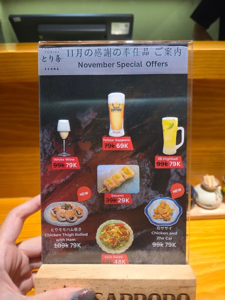 ミシュラン店で8年修行した店主が焼く焼き鳥が楽しめる「とり喜」では,11月限定で対象メニューをキャンペーン価格で提供中! 「とりモモハム巻き(10.9万VND→7.9万VND)」「ササミ串(3.9万VND→2.9万VND)」「鳥ザーサイ(9.9万VND⇒7.9万VND)」など。ビール,ワイン,ハイボールなどのドリンク類もお得価格で用意。この機会をお見逃しなく!