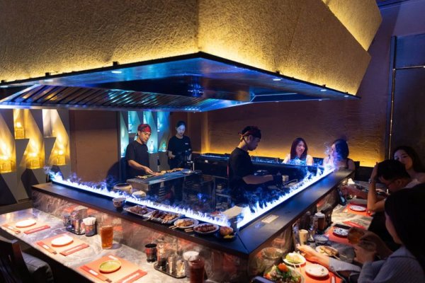 オープンキッチンのカウンター越しには、串を手際よく焼き上げる姿を楽しめる。ひときわ目を引くのが蒸気と光を使った炎の演出。安全性を保ちながらダイナミックな雰囲気を生み出し、つい見入ってしまうほどの存在感だ。演出を楽しめる特等席としてカウンター席は人気で、多くのお客さんがその瞬間を写真に収める。