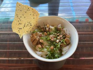 コシのある平打ち麺に、濃厚な鶏や豚のスープを少量だけ注ぎ、具材とよく混ぜて食べる“きしめん”と似ています。スープは魚介ベースの出汁とウコンの入った甘辛タレを含んだ美しい黄色。香ばしいピーナッツとカリカリのライスペーパー(バインチャン)を散らすのが定番です。