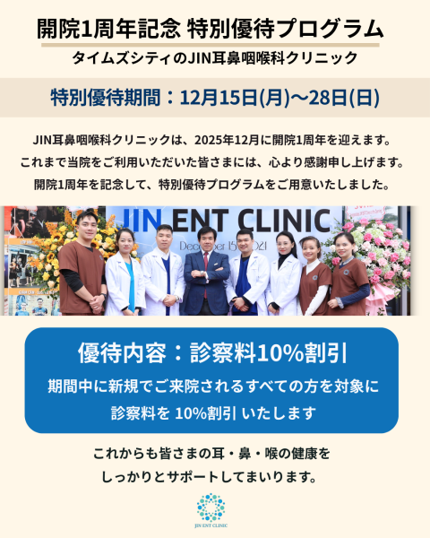 「JIN⽿⿐咽喉科クリニック」1周年記念で診察料10%OFF