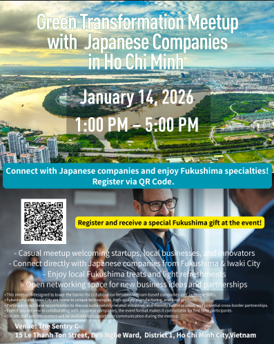 福島県およびいわき市から9社が参加し, “Green Transformation Meetup(商談会)” を開催。捨てられた素材に新しい価値を生み出すアイデア,ゴミを燃やさず資源化する環境ソリューション,エコ素材・次世代素材などを紹介。事前申し込みで,ギフトを進呈。