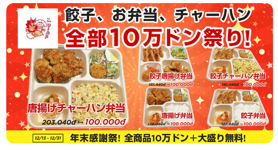 「おでん竹千代」と「葵寿司」が,「Capichi」デリバリーで年末感謝祭を実施中! 海鮮丼・お刺身・おでん盛りなど,通常14〜16万VND相当の人気メニューが今だけ10万VND! 12月末まで。新鮮なネタをぜいたくに使った「まぐろ丼」「サーモン丼」「三種お刺身」,だしがしっかり染みた「おでん盛り4種(大根・玉子・牛すじ・糸こんにゃく)」などが対象。このお得な機会をお見逃しなく!