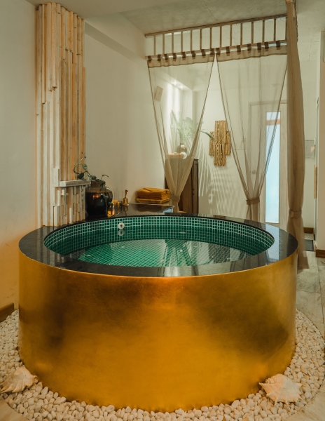 着いたらまずは庭園を望む席でウェルカムティーを味わい、穏やかな音楽に包まれながら深呼吸をひとつ。スパ時間の始まりを静かに感じられる。 施設内には、有機ハーブの蒸気とペパーミントの香りに包まれるサウナや、鉱泉浴槽(ハイドロプール)など、本格的な温浴施設が整えられている。体を芯から温めることで施術の効果がより引き出され、深いリラクゼーションを味わうことができる。