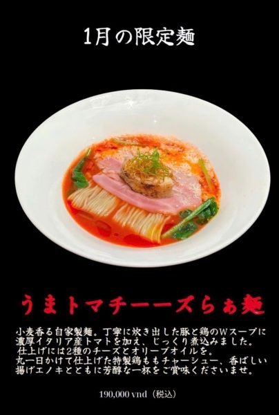 日本人のラーメン職人が腕をふるう「らぁ麺春樹」では,昨年末の第二回らぁ麺総選挙にて見事1位に輝いた「うまトマチーーズらぁ麺(19万VND/税込み)」が登場! 豚と鶏のWスープに濃厚なイタリア産トマトを加え,2種のチーズとオリーブオイルで仕上げ。特製鶏ももチャーシューと揚げエノキを添えた芳醇な一杯は,締めのリゾットもおすすめ!!