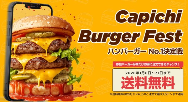 「Capichi」デリバリーでは,1月6日(火)から1月31日(土)までの期間限定で,ハンバーガーNo.1決定戦を開催中! 厳選したハンバーガーが送料無料(20万VND以上の注文で最大2万VND割引)で注文可。ハノイ&サイゴンのバーガーフェスで優勝したあのバーガーもお得に楽しめるチャンス!