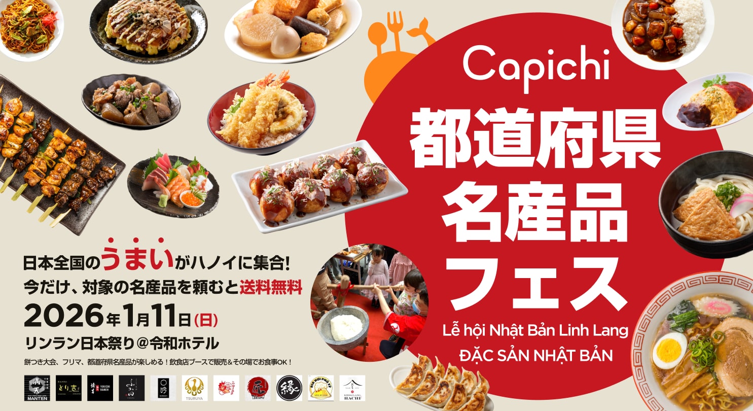 「Capichi」デリバリーでは,1月11日(日)に「令和ホテル」で催される「リンラン日本祭り」に合わせて,都道府県名産品フェスを1月31日(土)まで開催中。日本全国各地の名産品・ご当地グルメを送料無料で楽しめる特別キャンペーン!この機会をお見逃しなく!