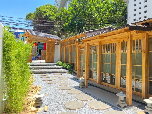 タイホー近くにある日本食レストラン「千葉さん」は、日本の和の情緒を感じさせる佇まいが印象的だ。門をくぐると、日本庭園を歩いているかのような小道が続き、足元に敷かれた砂利、大ぶりの石や緑が、お店に入る前から和の雰囲気を演出する。