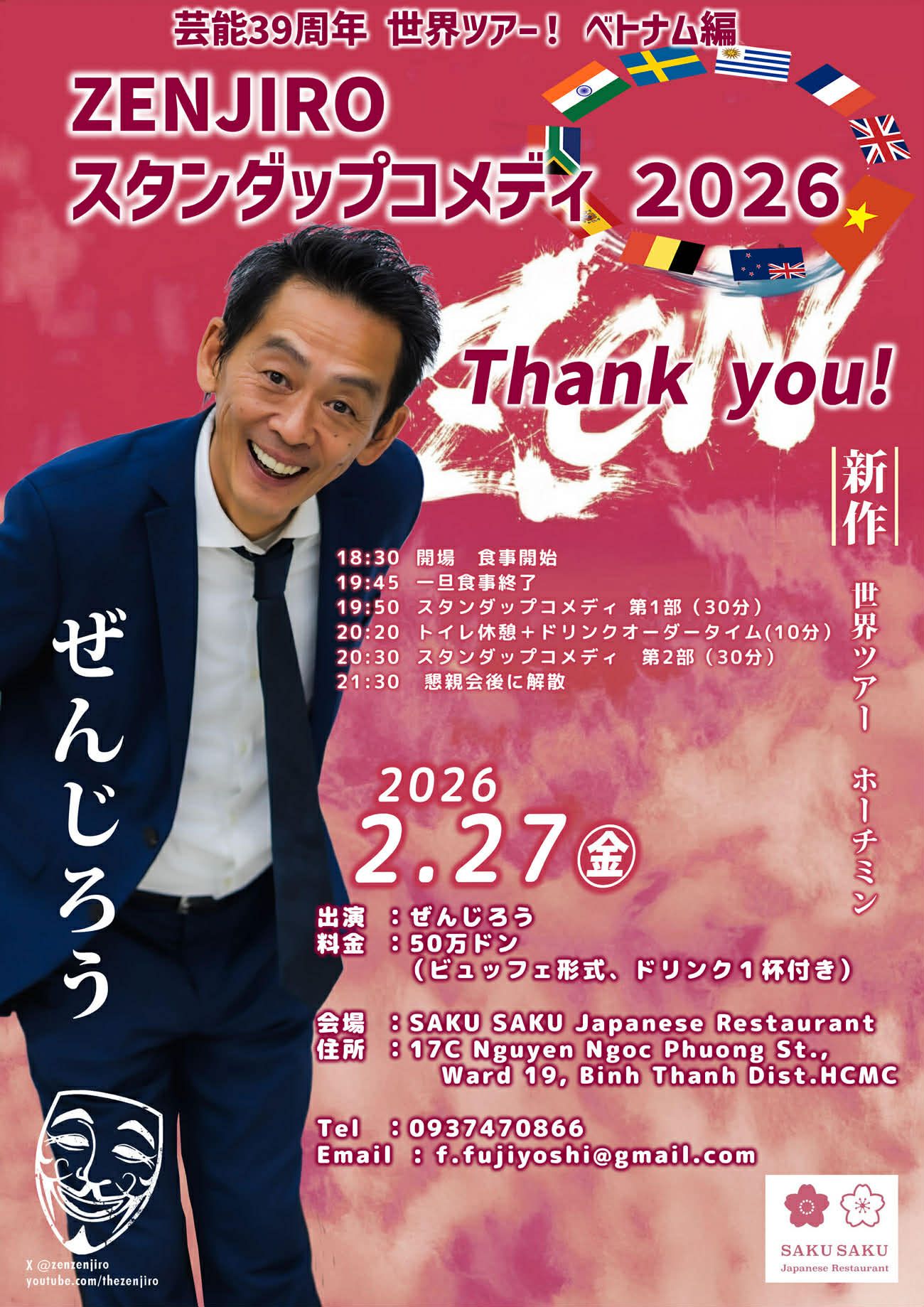 昨年6月の爆笑ライブから8ヶ月。世界を股にかけるぜんじろうが再びサクサクに登場!テト明けの福を「笑い」で呼び込みましょう。お早めにご予約ください!