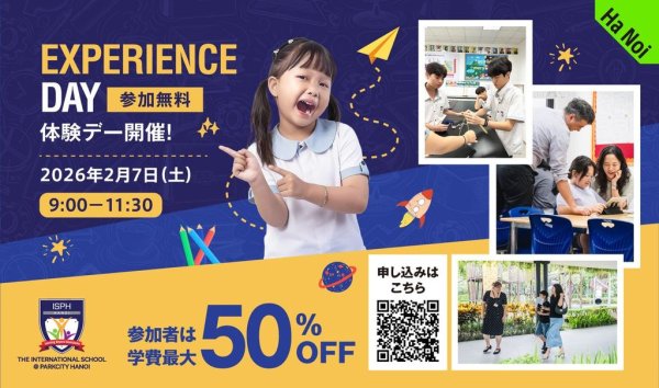 ハノイで人気の英国式インターナショナルスクールISPHでは、2026–2027年度入学をご検討中のご家族向けに体験日を開催します。体験授業や校内見学、教員との個別相談を通して、英国式教育の特長を親子で体感いただけます。当日参加の方には、早期入学特典として最大50%OFFの特別優待をご用意しています。参加無料です。