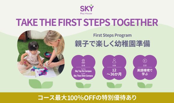 Sky International Preschoolでは、12~36か月対象の「First Steps Program」をハノイ・ホーチミンで開催。親子で英語環境に慣れ、遊びを通して楽しく幼稚園準備を体験でき、最大100%OFFの特別優待もご用意。