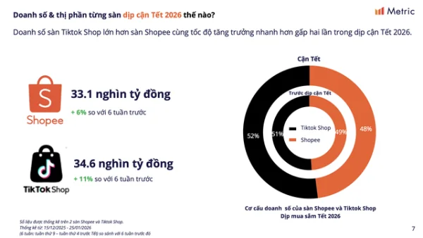 電子商取引(EC)データ解析を手がけるMetric.vnによると、旧正月(テト)前の6週間(2025年12月15日から2026年1月25日まで)で、電子商取引(EC)大手のShopee、およびTikTok Shopの売上総額は約67兆7000億ドンに達した。