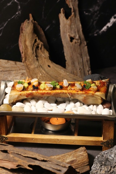 特に印象的なのが「Beef Bone Marrow」。オーストラリア産牛骨の骨髄の上にローストしたエビとエビソース、とびっこ、マスタードシードのピクルスを合わせた、パン付きの華やかな一皿。インパクトのある見た目と濃厚な味わいが食事を盛り上げる特別な一品だ。スペイン×トロピカルの創作タパス「Duck Taco マンゴーソース&クリームチーズ」も外せない。