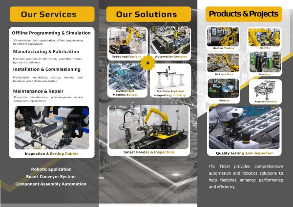 Với hệ thống quản lý chất lượng ISO 9001, đội ngũ kỹ sư được chứng nhận về lập trình robot, PLC, và là đối tác tích hợp công nghệ của các hãng robot hàng đầu Fanuc, Epson, Mitsubishi, v.v…ITS TECH luôn đồng hành cùng nhà máy thiết kế riêng theo quy trình sản xuất thực tế của doanh nghiệp giúp đạt mục tiêu cụ thể: tăng năng suất, giảm lỗi, truy vết dữ liệu, giảm phụ thuộc nhân công, cải thiện an toàn.
