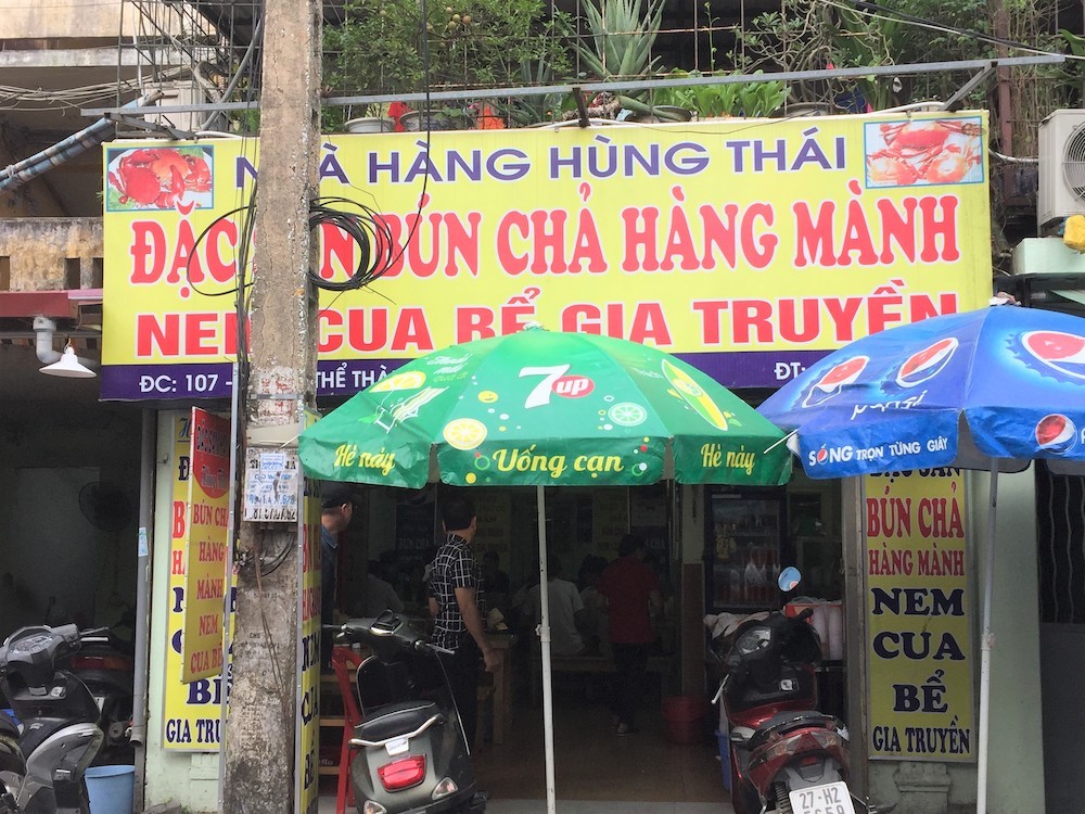 街の中心部から少し離れてはいるが、わざわざ食べに行く価値のある一軒。実際遠くから足を運ぶ人も多い。訪れる人の目当てはブンチャー。店頭で炭火焼きにされる香ばしい肉、適度な荒みじん切りで作られた肉のかたまりに、香草とブンがたっぷり添えられ、食べ応えは満点。他店よりも濃いめのスープも人気の理由だ。観光客にはまだあまり知られていない地元の人に愛される名店。