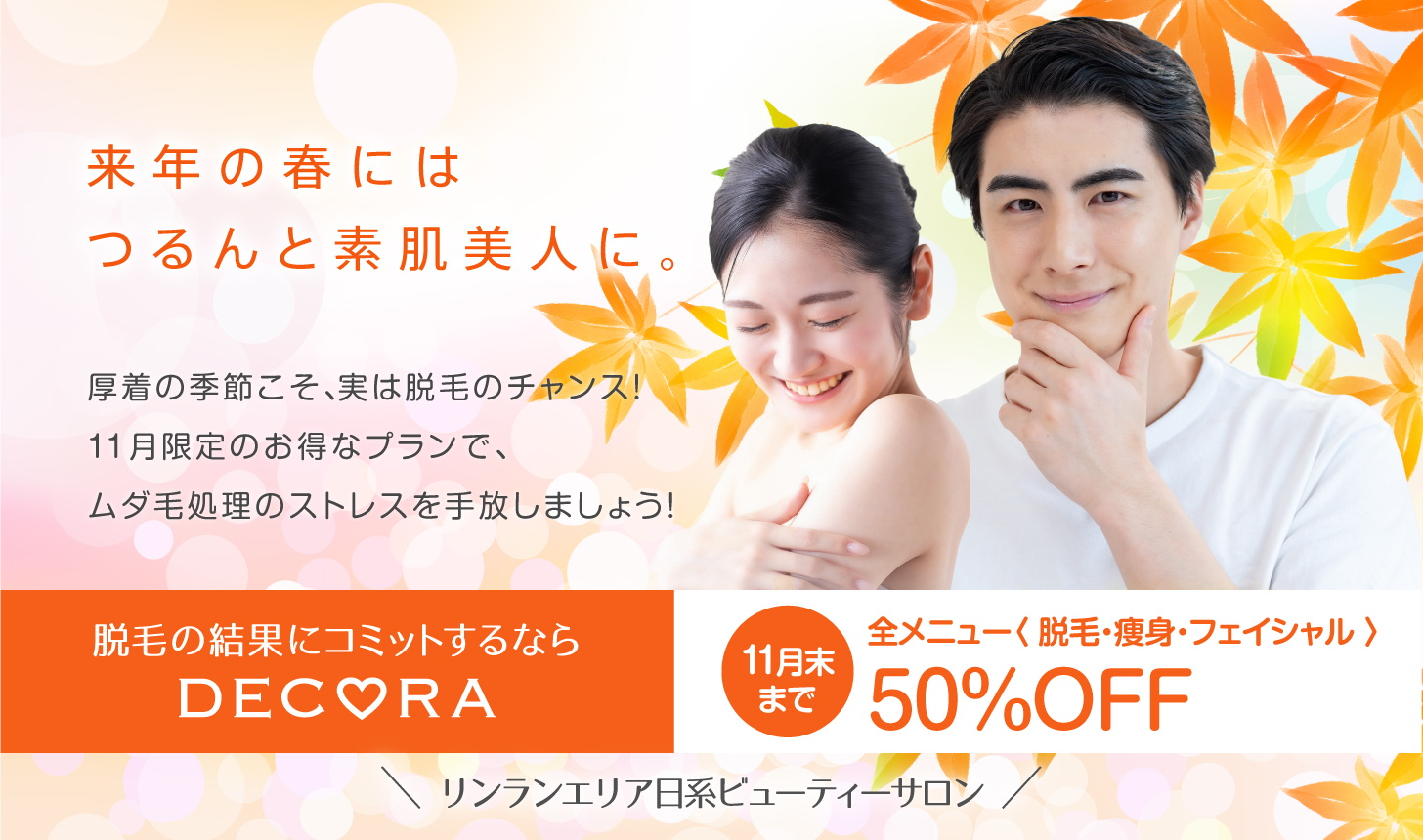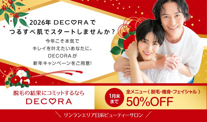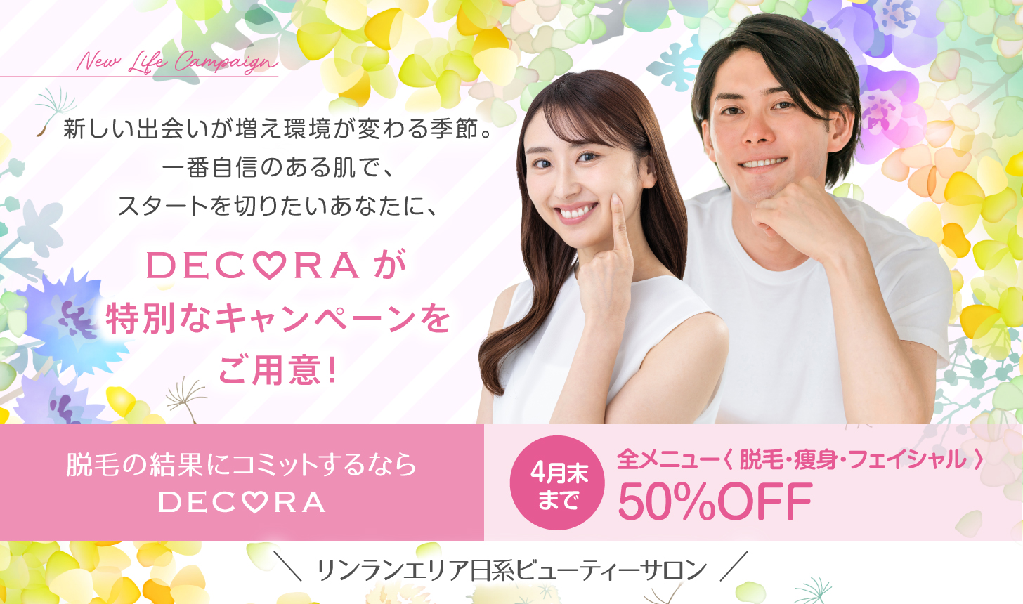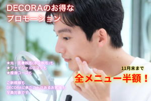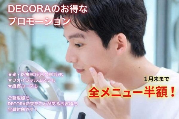 もちろん今回のキャンペーンは脱毛だけではなく、全コース対象なので、フェイシャルエステや痩身も半額となります!(DECORAに行ったことがある方も対象)