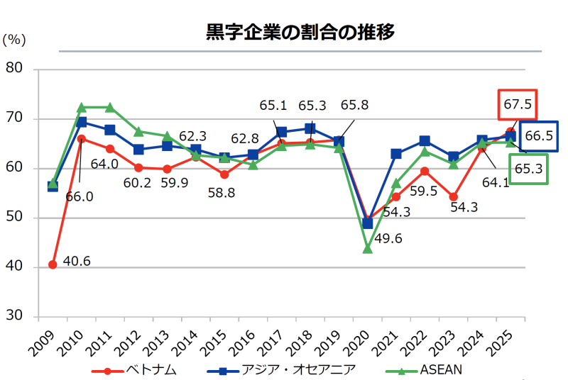 この調査によると、在ベトナム日系企業の67.5%が黒字と回答しました。これは2009年以降で最も高い水準であり、ASEAN主要国と比較しても高い数値です。製造業・非製造業ともに前年から改善しており、全体としては安定した業況が続いています。