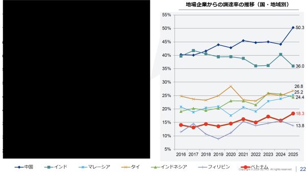 現地調達率は38.1%まで上昇し、なかでも地場企業からの調達比率は過去最高水準となっています。国内サプライヤーの技術力や品質管理能力の向上が進み、サプライチェーンの現地化が着実に進展しています。これは円安をはじめとする為替変動リスクの抑制や物流効率化にも寄与し、中長期的な競争力強化につながる動きと評価できます。現地企業との関係深化は、産業基盤の強化という観点からも重要な意味を持っています。